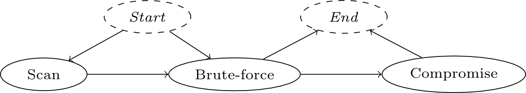 Dictionary attacks typically feature three phases. The first phase is the ‘scan phase’, here an attacker scans the network for the targeted services. The second phase is the ‘brute-force phase’, this is the phase where all the login credentials are tried. This can end in two ways. Either no valid credentials are found and the attack is ceased. Or the last phase is seen, the ‘compromise’ phase, here the attacker has gained entry to the back end and is, for example, able to upload illegal content. Brute-force attacks are usually detected by analysing access logs, if they are detected at all. This host-based approach is hardly scalable in larger networks, since access to the logs is required. Besides the host-based approach, a network-based approach can be taken. This approach can be divided into two categories, namely packet-based and flow-based. To explain these two categories we take another look at our PostNL analogy of earlier. Packet-based intrusion detection systems can be seen as systems that open each and every packet that passes by to analyse their contents for malicious traffic. As you’ve likely realized if the packages are encrypted, if a lock is added, the IDS is no longer able to open the package and analyse its contents. The flow-based approach does not face this problem as it looks at packet headers, not their payload. A flow can be seen as the label that is attached to each packet. It lists the sender and destination. The weight of the package. If the package is part of a sequence it lists how long the sequence is, etc. This analogy is not very accurate, but it gives you an idea of what a flow is. Analysing the traffic generated by dictionary attack tools allowed us to develop signatures. These signatures, as shown in Figure X, can be used to detect dictionary attack from flow data. As can be seen there are two ranges defined, the packets per flow (PPF) and bytes per flow (BPF).