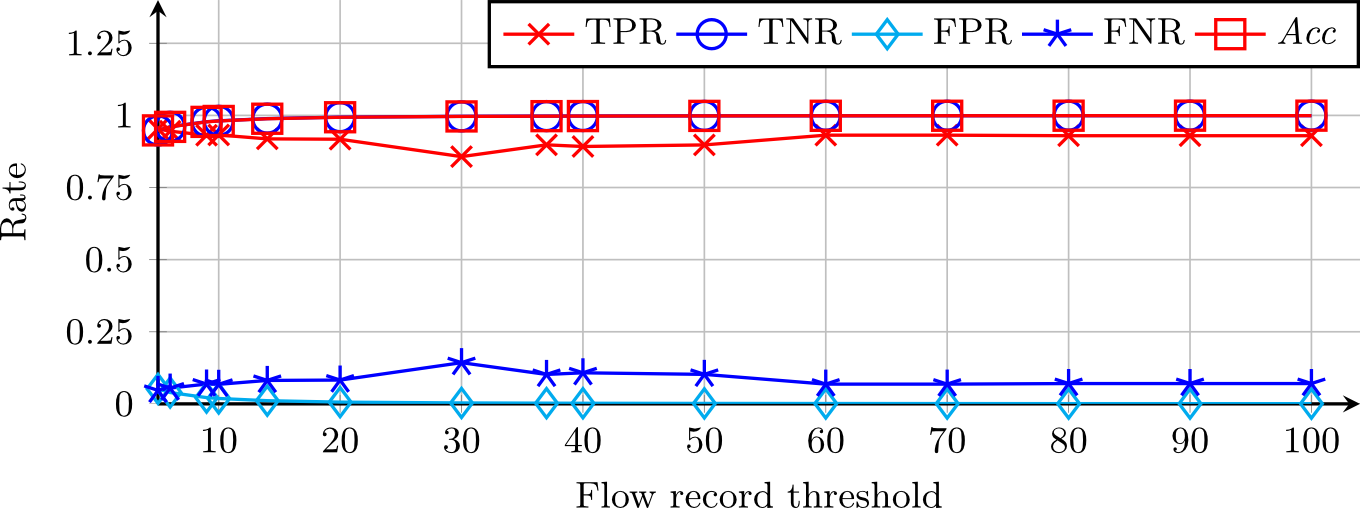During my Bachelor assignment much effort was put in developing a flow-based prototype IDS. This prototype uses the signatures we have developed to detect dictionary attacks from given flow data. It detects attacks in three stages. First, a preselection stage, here the data is filtered to generate a list of source and destination IP address tuples with at least one flow matching at least one flow. Second, the detection stage, this is where the detection algorithm comes in. Every flow between the preselected IP address tuples are checked against the signatures. As the signatures defines different ranges there are also different modes of operation. Either only the PPF, or BPF, is used or both the PPF and BPF are used for the signature matching. If a tuple shows a consecutive number of flows higher than a given threshold it is marked as being an attack. And thirdly, the signature matching stage. This stage is necessary as there can be multiple signatures used in the detection stage. The basis of the signature matching algorithm finds its roots in the field of digital communication, namely the signal space concepts, where bits are mapped to a signal space to determine if a one or a zero was sent and received. Instead of using bits in a constellation diagram, we user the number of PPF and BPF on the axes of an imaginative constellation diagram, and the Pythagorean theorem for finding the signature that is closest to the analyzed traffic.